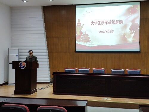 随后何老师从国家,长沙市,湖南大学的层面介绍了对于应征入伍大学生的优惠政策。政策包括了资金、教育等各个方面的优惠,何老师耐心介绍,同学们认真聆听。