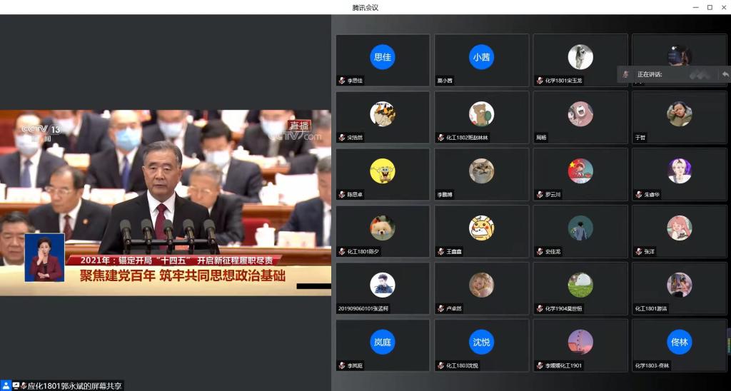 开幕会后,三个本科党支部的成员们就全国政协十三届五次会议开幕会分享学习心得。其中本科化工党支部黄亚楠同志表示今日汪洋主席一句话令他影响深刻——“要努力做担当者而非旁观者、践行者而非清淡者”。他认为关注人民生活最重要的就是付诸行动改善人民生活;本科化学党支部陈思卓同志讲到:“两会串联大之国家的宏愿与小之个人的希冀。防疫、双减、冬奥、妇女儿童拐卖等等全民重视的问题也同样牵动着委员的思绪。全国两会汇集民智、反映民意、影响民生,回应老百姓们的关注。”最后,本科应化党支部杨张帝同志表达了对祖国的美好祝愿:“是祖国的强大一直保护着我们,让我们幸福安全,希望祖国越来越繁荣昌盛!”