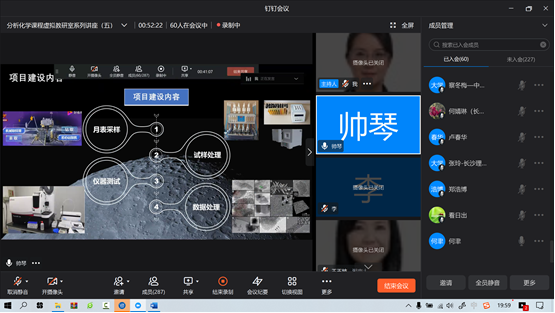 地球观测与信息提取的新理论、技术和方法也属于“十四五”NSFC地球科学部优先发展领域。因此,分析化学课程在地质行业人才培养中的重要地位日益凸显。帅琴教授对本校分析化学课程团队如何结合地质大学人才培养特色及行业需求,紧扣服务国家资源战略和国民经济主战场主题,以提高教学质量建设一流课程为宗旨,进行《分析化学》课程群系列课程建设做了详细介绍。提出根据不同专业需求设计分层教学,结合行业需求补充课程内容,拓展课堂外资源延伸课程边界,创新教学手段推进数字化进程,开展基于探月工程的月壤组成和性质分析虚拟仿真实验研究等课程建设的创新思路和有效举措。介绍了如何结合案例分析,采用翻转课堂、对分课堂等课堂讨论方式,激发学生的潜能,提高综合能力。来自分析化学课程虚拟教研室和化学类专业基础理论课程虚拟教研室的六十余位教师参与了本次教研活动。教研交流最后,国家教学名师、湖南大学王玉枝教授做了总结发言,她充分肯定了中国地质大学分析化学课程团队在行业特色拓展课外资源建设、校企结合实施地质分析卓越计划、基于探月工程的虚拟仿真实验建设和基于课程群的团队建设中所取得的成果,她指出本次教研交流加强了高校分析化学课程教师之间的跨校“交流、互助、共建、共享”,也为新时代背景下,如何面向行业需求来开展课程建设提供了新的思路和实践经验。