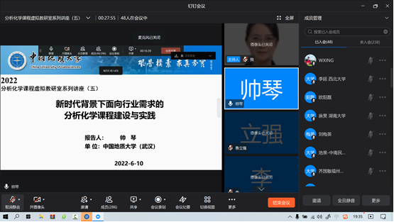 6月10日晚上,分析化学课程虚拟教研室举行了第五期讲座,由湖南大学宦双燕教授主持,来自中国地质大学(武汉)的帅琴教授为主讲嘉宾,她报告了新时代背景下面向行业需求的分析化学课程建设与实践。