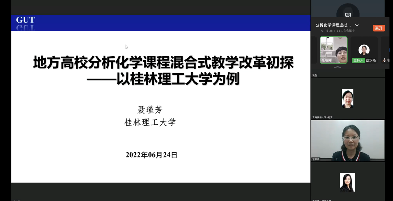 6月24日晚,分析化学课程虚拟教研室举行了第六期讲座,由湖南大学宦双燕教授主持,来自桂林理工大学的聂瑾芳教授为主讲嘉宾,她以桂林理工大学为例介绍了地方高校如何开展分析化学课程混合式教学改革。