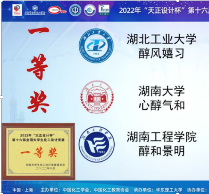 8月17日-8月22日,第十六届全国大学生化工设计竞赛全国总决赛在线上举行,湖南大学心醇气和团队(成员:关育宁、王圣宇、王一可、王才荣、吴一迪)获总决赛一等奖。