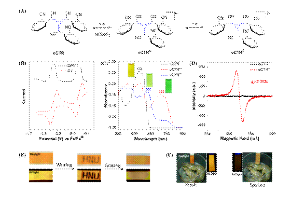 值得一提的是,α-氰基三芳基[3]轴烯体系中多个氰基的缺电子效应,使交叉共轭衍生体系拥有较低的LUMO能级(-4.79 eV)和较强的电子亲和力。这类衍生的功能分子材料可通过有效的电子转移方式(如有机胺作为电子供体),转变为稳定的轴烯自由基阴离子与轴烯双阴离子,其电子转移过程具备可逆响应性,且可程序设计,同时伴随着光吸收颜色的显著变化(黄色到绿色),以及开关荧光和电子自旋共振/超导量子干涉等灵敏磁信号的输出(图2)。鉴于此,作者也利用这种多模态信息转换,构建了概念性的传感试纸系统,验证了图文信息加密的有效处理,以及对变质食物中有机胺开启灵敏传感显示。