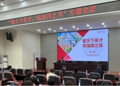 陈仁朋校长以“两弹一星”元勋们响应国家号召,以身许国,开创我国20世纪科技自主创新的辉煌伟业的事例,从国家科技发展进程角度诠释了“人才强国”的重大意义。陈校长多方位解读了习近平总书记在2021年两院院士大会上的讲话和党的二十大与科技教育人才战略,强调“教育、科技、人才是全面建设社会主义现代化国家的基础性、战略性支撑。必须坚持科技是第一生产力、人才是第一资源、创新是第一动力......”,鼓励党员同志发扬科学精神,按照办好人民满意的教育要求,加油鼓劲,把党中央关于科技创新战略落到我们的教学研究中。最后,陈校长回顾了我校自2016年以来的人才引进和人才培养情况,并对我校未来人才储备和人才发展寄予厚望。