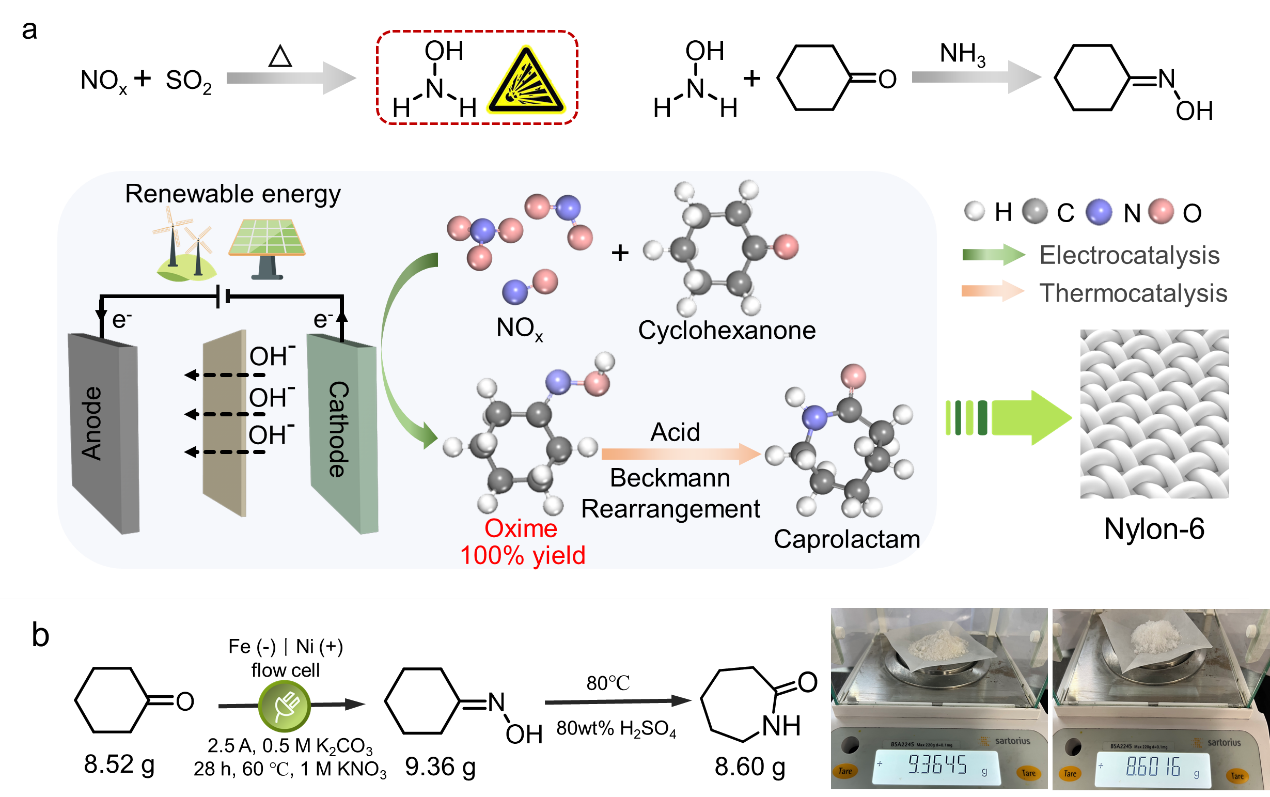 近日,湖南大学王双印教授团队提出了一种使用氮氧化物和环己酮直接电合成环己酮肟的方法,收率接近100%,避免了使用高浓度羟胺溶液,展示了一种简单的绿色生产尼龙6前驱体的策略。