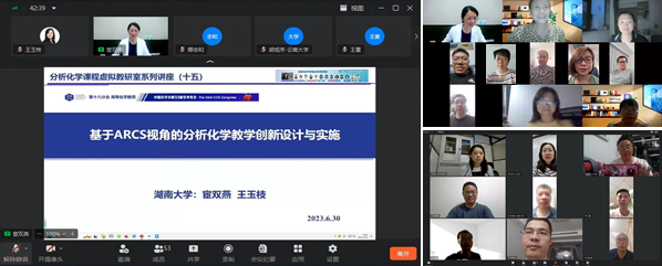 6月30日,分析化学课程虚拟教研室举行了第十五期讲座,由王玉枝教授主持,湖南大学的宦双燕教授为主讲嘉宾,她报告的题目是:基于ARCS视角的分析化学教学创新设计与实施,来自分析化学课程虚拟教研室和化学类专业基础理论课程虚拟教研室的75位教师参加了本次线上会议。