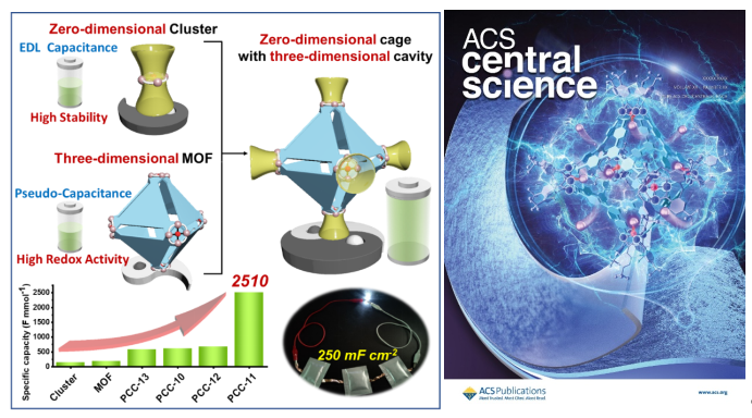 今年4月,方煜课题组通过一系列具有不同空腔的PCCs,研究了其作为柔性超级电容器的电化学行为和储能机制。这些PCCs表现出优异的电容器性能,其中锰基PCCs具有高达2514 F mmol-1的摩尔比电容、250 mF cm-2的高面电容和独特的循环稳定性。相关研究成果在国际知名期刊ACS Central Science(美国化学会中心科学)上发表,并被选为封面文章。方煜教授为论文单独通讯作者,湖南大学为唯一通讯单位,博士研究生刘康恺同学为第一作者。该工作得到了中组部项目、国家自然科学基金项目以及湖南省基金项目的支持。