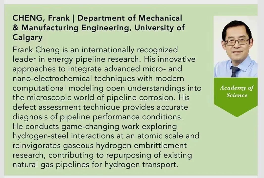 金属腐蚀与防护研究所(现金属所),1996年留学加拿大阿尔伯塔大学,1999年获材料工程博士学位。现任卡尔加里大学终身教授、先进材料与制造中心主任,为加拿大能源管道领域首席科学家、杰出材料科学家。目前主要从事氢气、二氧化碳和天然气管道的材料科学、电化学腐蚀与结构完整性研究。程玉峰以其在能源管道电化学腐蚀科学和材料科学领域做出的开创性研究成果以及巨大国际影响力当选加拿大皇家科学院院士。