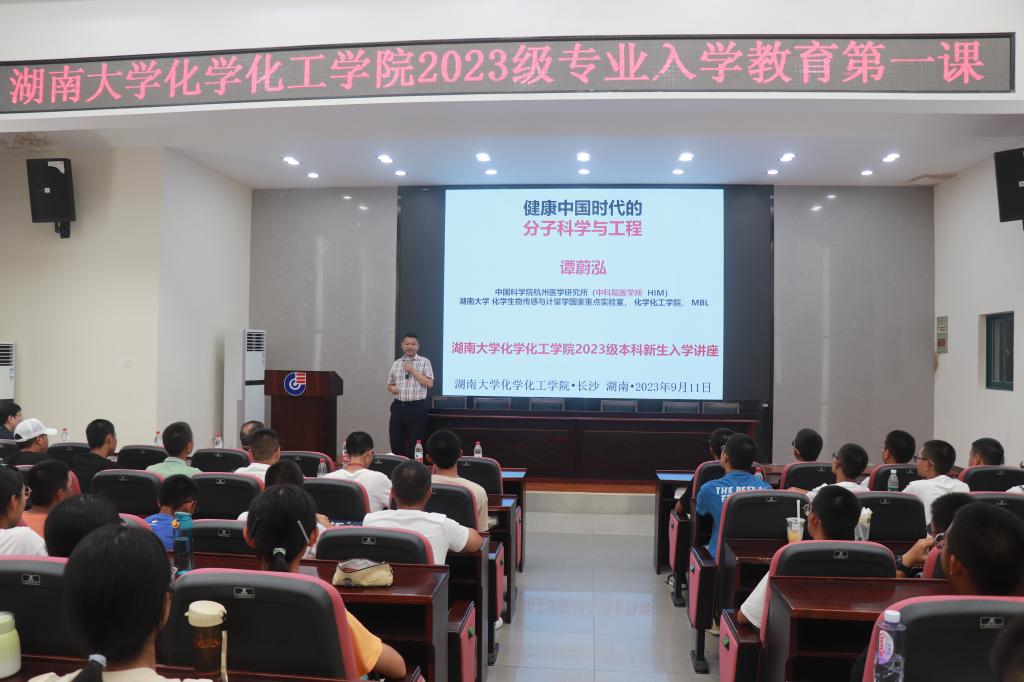 院士谭蔚泓作“健康中国时代的分子科学与工程”主题讲座。院长张晓兵出席,院党委副书记李洪玉主持,250余名2023级本科新生参加入学教育第一课。