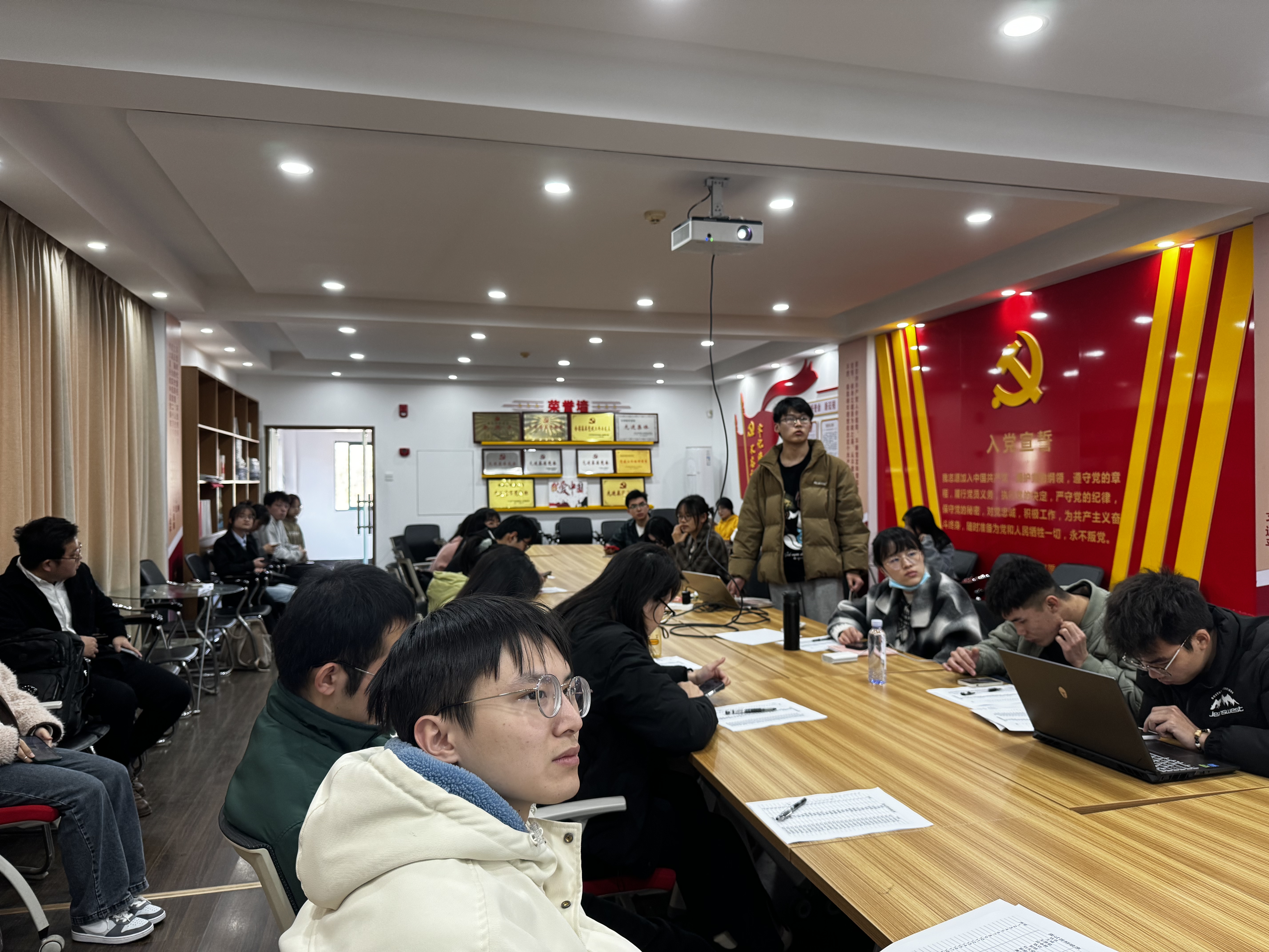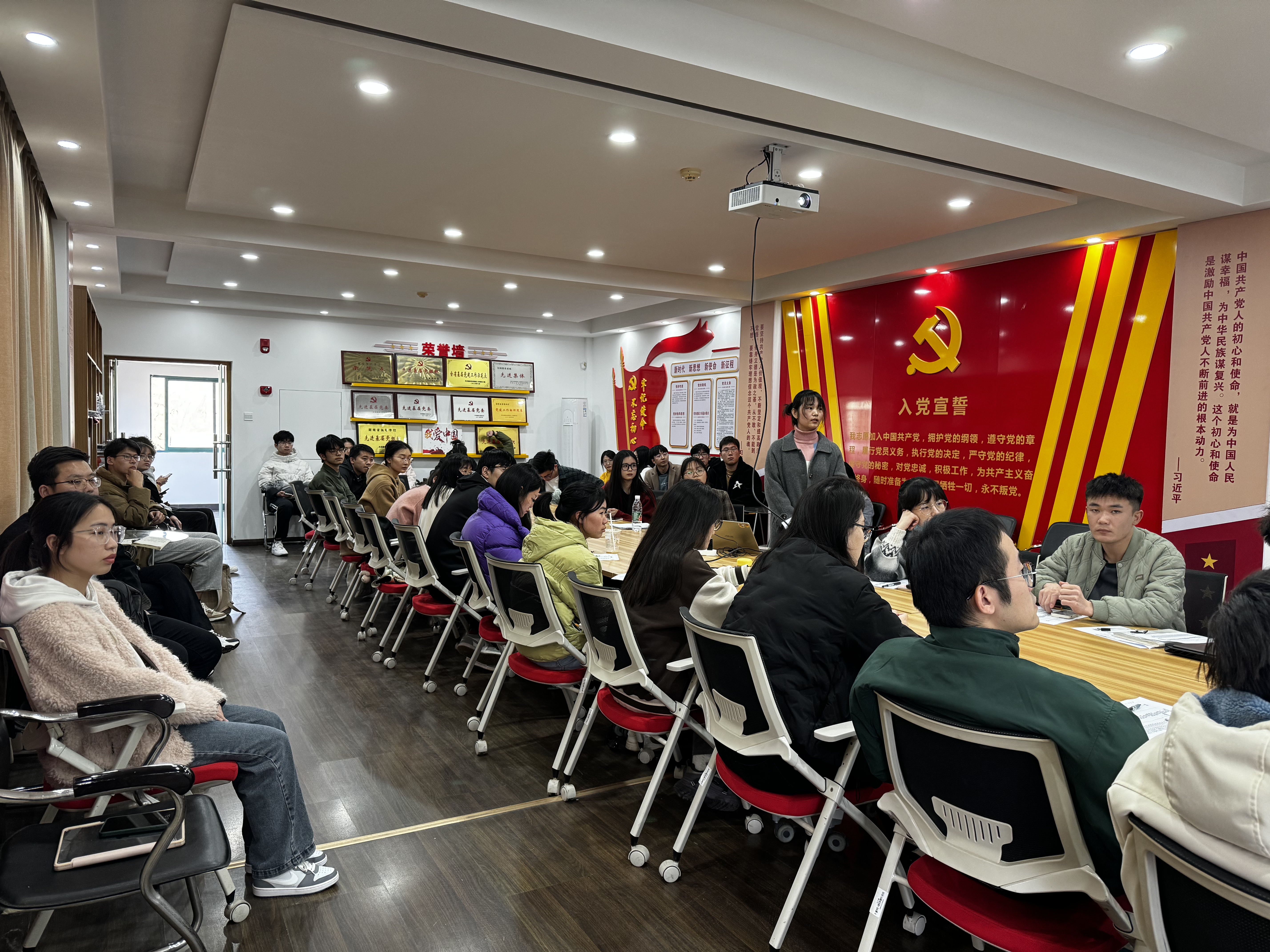 2023-2024学年春季学期研究生党员发展对象选拔答辩于新化工楼D区党员活动室举行。本次答辩会由研究生辅导员徐晓宇主持,学院学工办主任刘卓老师和11名学生党支部书记担任答辩评委,共有27名研究生入党积极分子参与答辩。