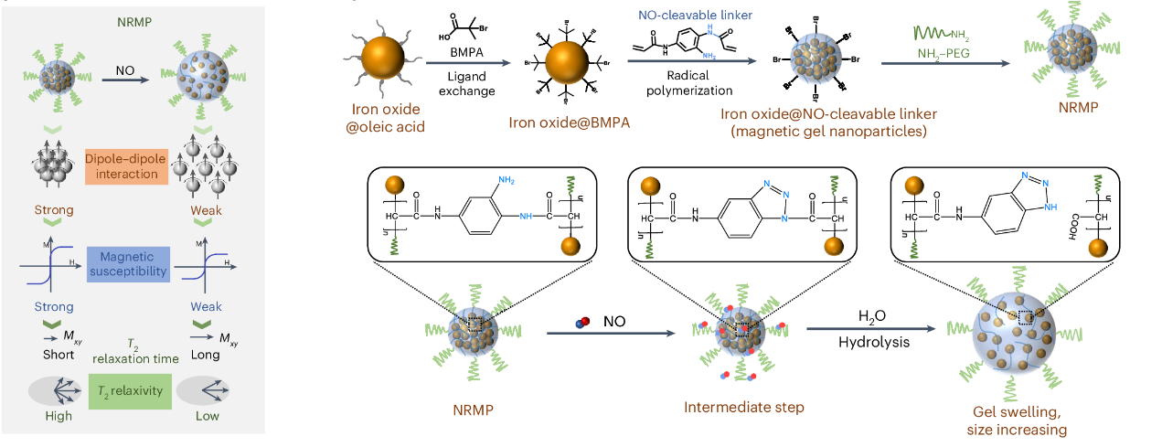 近日,湖南大学宋国胜教授和张晓兵教授团队成功开发出一种基于超顺磁性纳米颗粒的NO磁共振成像探针,通过NO切割反应调控纳米探针的磁化率及饱和磁化强度,从而实现NO的高灵敏度检测。该探针在NO的检测中显示出高特异性和抗干扰能力,同时能够感知NO浓度的微小变化,检测限为 0.147 μM,为在活体中准确定量NO的水平提供了可靠的技术支持。