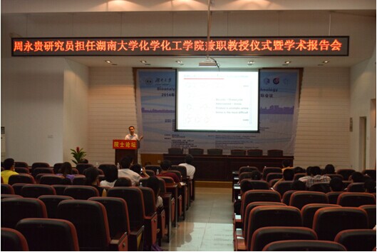 会议由电子竞技 副院长江国防主持。院长蒋健晖教授向在座的师生介绍了周永贵研究员的工作经历和研究方向,对周永贵研究员开展的研究工作给予了高度评价,并代表全院师生对其受聘为学院兼职教授表示热烈欢迎。随后,蒋健晖院长与郭灿城教授为周永贵研究员颁发了聘书,蒋健晖院长为其佩戴校徽。周永贵研究员对电子竞技 聘任其担任兼职教授表示感谢,并表示将通过开展合作研究、联合培养研究生等多种途径为学院的建设发展做贡献。随即,周永贵研究员为师生作了题为《芳香化合物的不对称氢化》的学术报告。学术报告持续近两个小时,既报告了其研究方向的国际前沿动态,又具体详细地阐述了其领导的课题小组在此领域研究的具体问题。报告完毕后,周永贵研究员还与在座师生进行了热烈互动,对师生有关学术研究、课题选择以及该课题中的相关问题进行了深入探讨和细致解答。