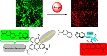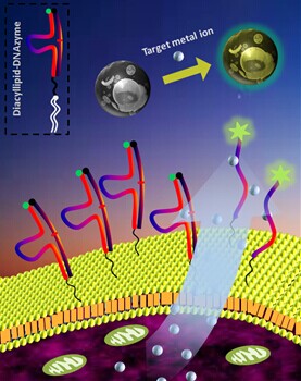 在活细胞生物成像方面,该课题组同样取得了突破性进展。他们利用脂质体-DNA共轭物在活细胞表面高效自组装了DNA生物传感器,实现了对细胞微环境中特定目标物的实时在线检测分析(J. Am. Chem. Soc., 2014, 136 , 13090)。基于TBET能量转移机制,课题组开发了一种双光子荧光探针,实现了对活细胞和组织的比率成像分析(J. Am. Chem. Soc., 2014, 136 , 9838)。利用常见的小分子试剂开发了一种简易、高效、低成本的方法实现了疏水性磁性颗粒从油相到水相的转换。该方法有效地解决了疏水性纳米颗粒在生物成像和药物输送等方面的瓶颈问题(J. Am. Chem. Soc., 2014, 136 12552)。除此之外,他们首次利用表面生长石墨烯的方法成功研制了超级稳定的银纳米颗粒,并通过在表面功能化修饰核酸适配体和炔基分子实现了靶向和低背景拉曼成像(J. Am. Chem. Soc. 2014, 136, 13558)。