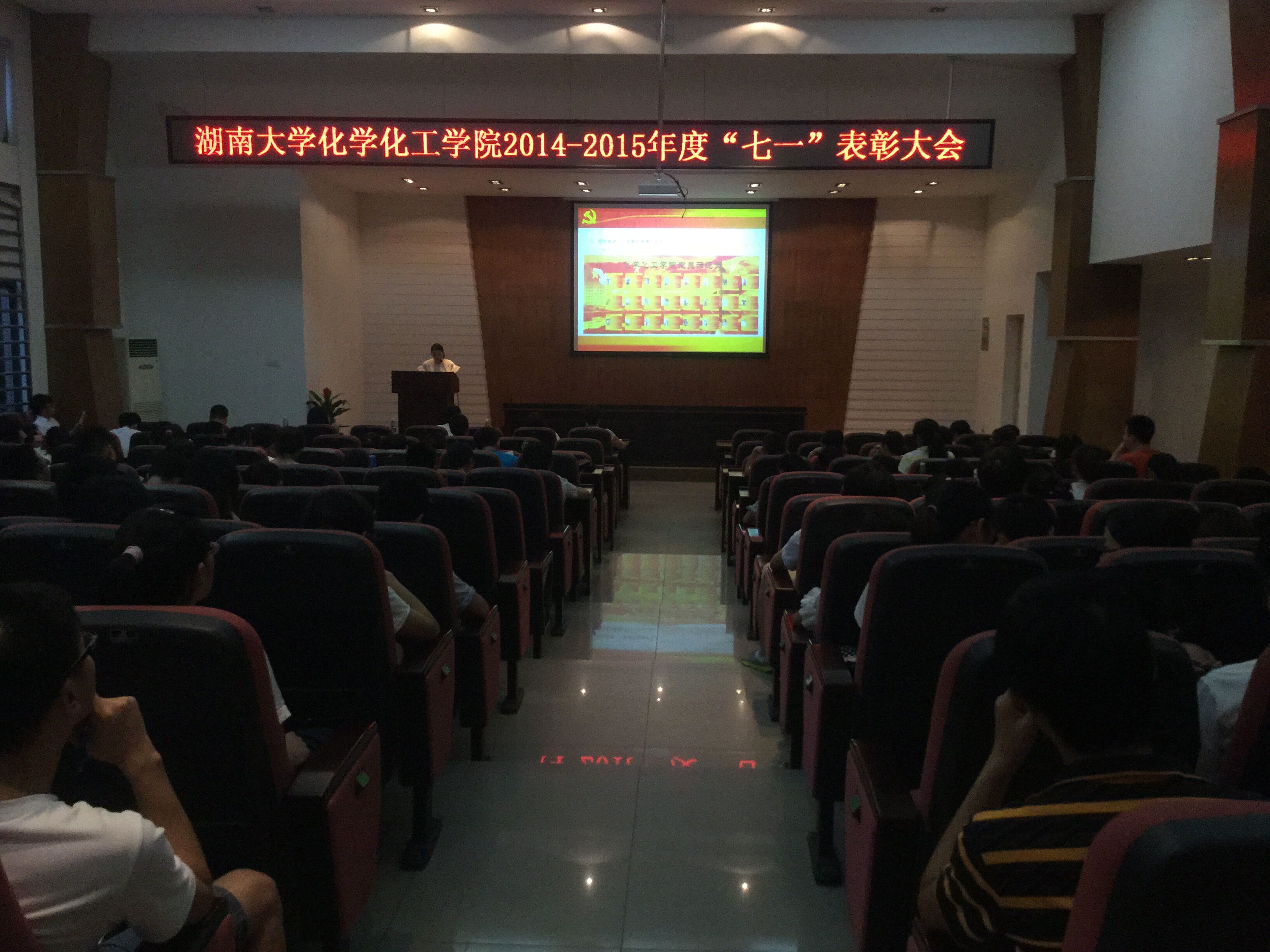 党委隆重举行了2014-2015年度“七·一表彰”大会,对本年度涌现出的一批学生党建先进集体和优秀个人进行表彰。应邀出席本次表彰大会的嘉宾老师有学院党委副书记陈义红老师,学工办主任曾芳老师,研究生辅导员刘卓老师,学院团委书记辅导员陈晓晖老师,辅导员李辰老师、曾芷兰老师、刘世明老师。同时,我院全体学生党员参加此次表彰活动,会议由朱天时同志主持。