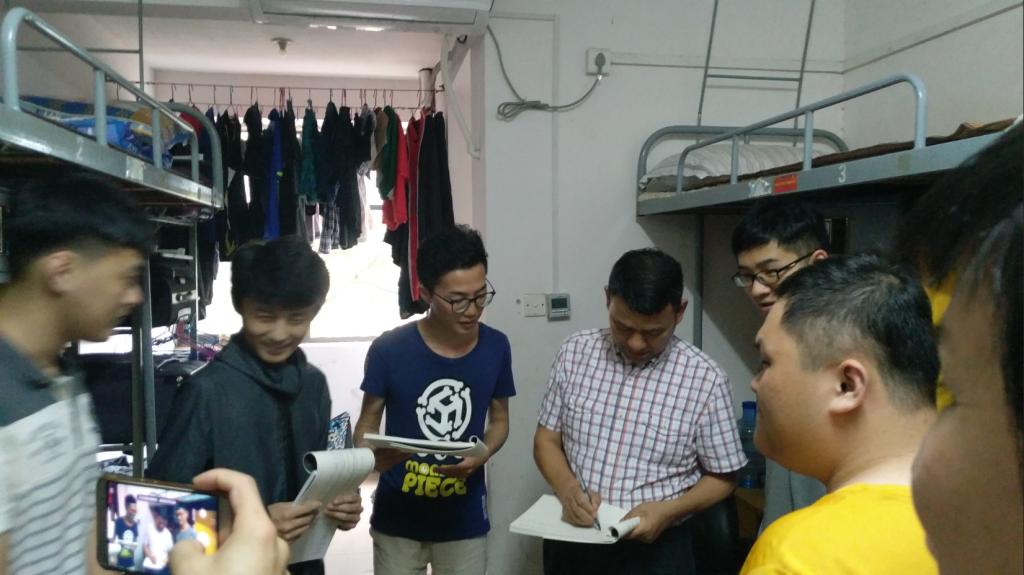 2018届毕业生,详细地了解寝室同学的去向,在一个宿舍,四位同学分别保送至南开大学、中科院长春应化所攻读研究生以及跨专业考研至湖南大学信息科学与工程学院和考上公务员,谭老师鼓励攻读本专业研究生的同学继续努力,再作出更加优秀的成果,对于跨专业读研的同学,希望他们可以在交叉学科方面作出成果,对于扎根基层的公务员期望他们可以在自身的岗位上发光发热,展现湖大人的风采。