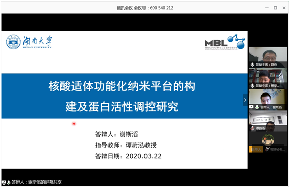 首场博士学位论文答辩以线上视频答辩方式进行。此次答辩委员会由湖南大学聂舟教授、刘艳岚教授、邱丽萍教授及长沙理工大学杨荣华教授、国家纳米科学中心孙佳姝研究员组成。导师谭蔚泓教授以及多名师生在线聆听了本次论文答辩。答辩委员会对张代亮、谢斯滔两位同学的博士学位论文表示充分肯定,认为其选题紧扣化学与生物学交叉的前沿领域,研究内容创新性强,论文撰写规范,行文流畅,条理清晰,数据翔实。经过线上讨论和无记名投票表决,答辩委员会一致同意通过张代亮、谢斯滔同学博士学位论文答辩,并建议授予其博士学位。